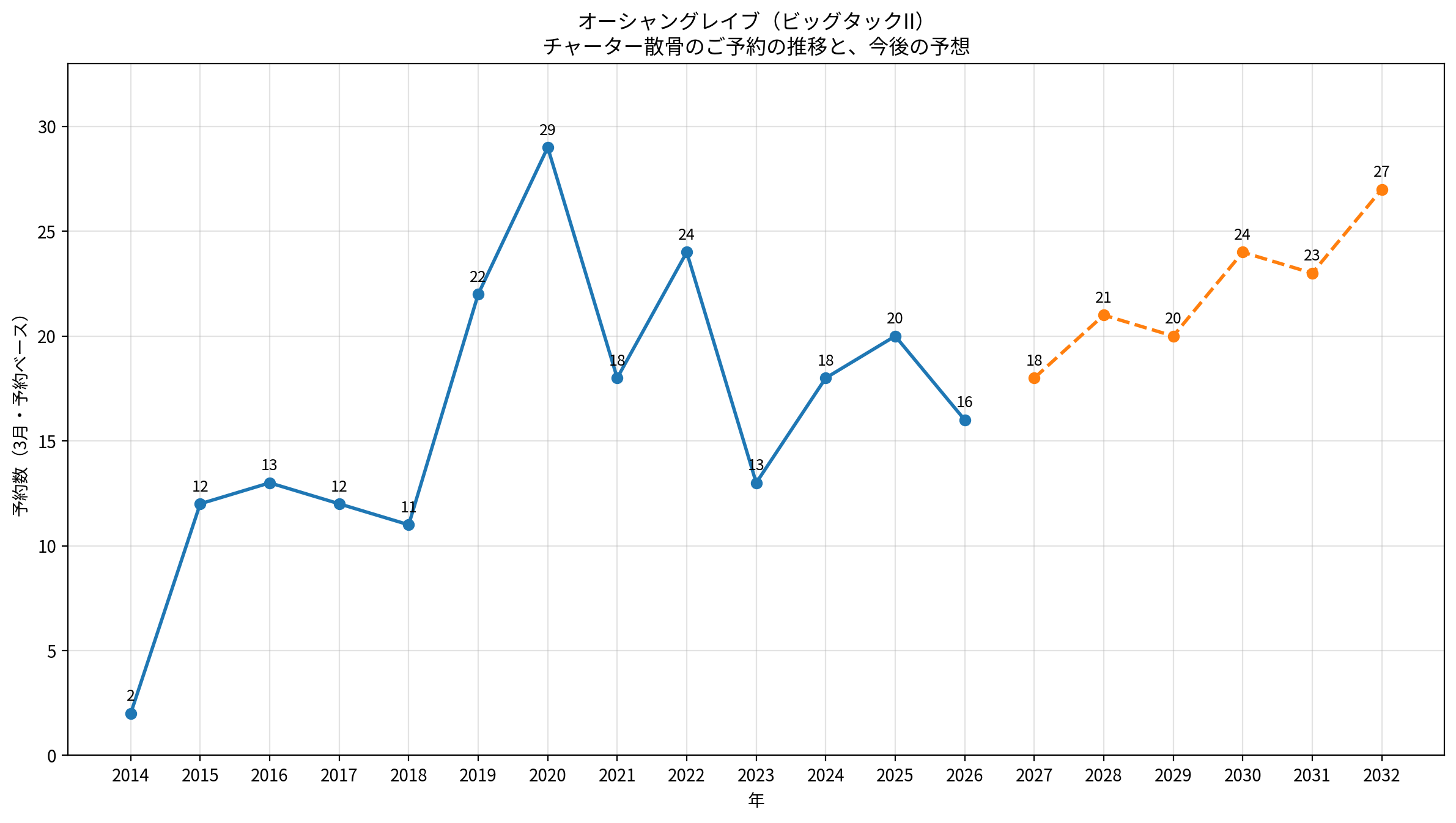 弊社が国土交通省・関東運輸局に不定期航路事業の届出を行った後の 2014年から2026年3月までの各年3月時点におけるご予約数の推移 を確認してみました。